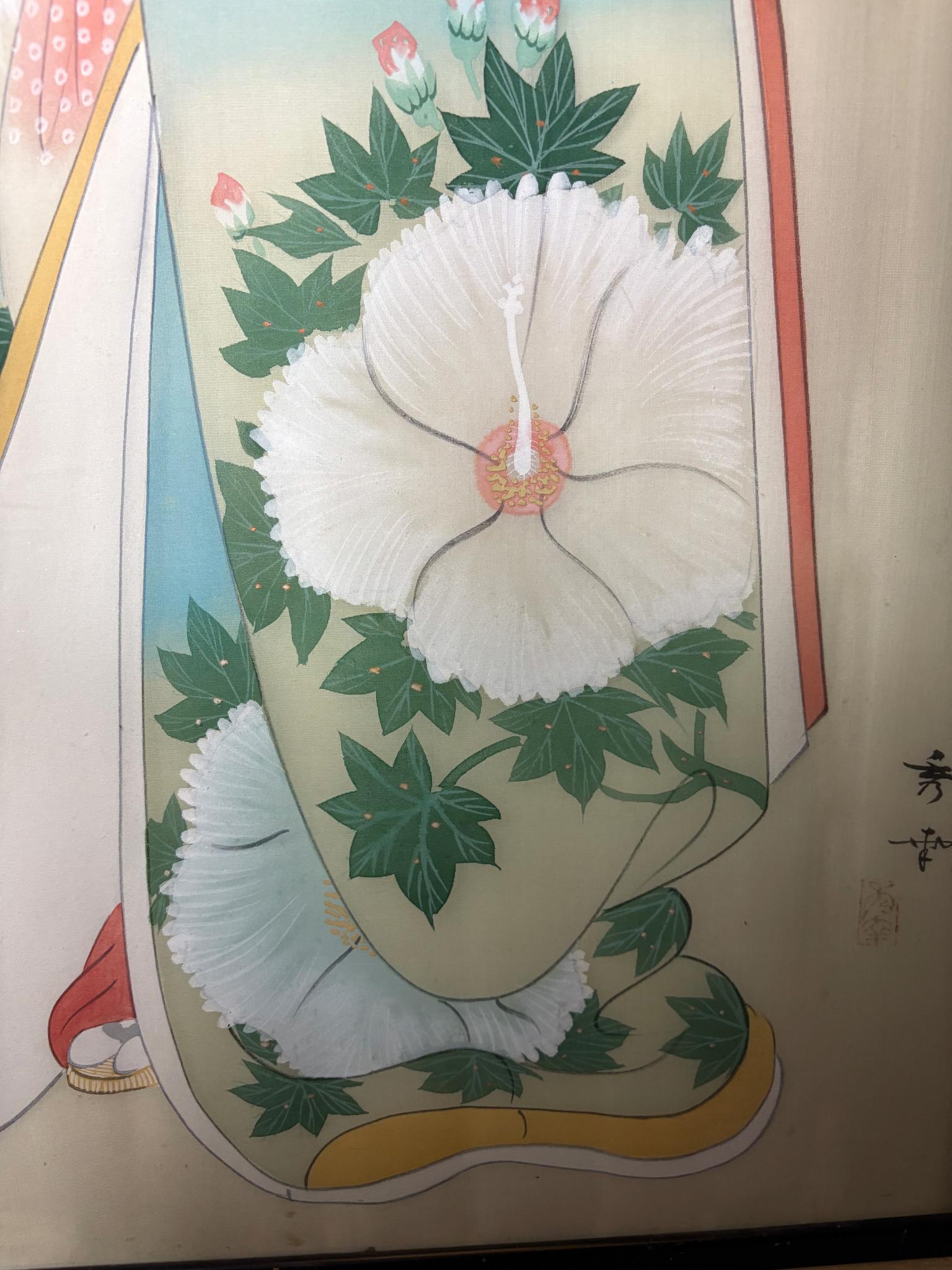 Large Signed Japanese Silk Painting of a Beauty with Fan, c. 1930–60