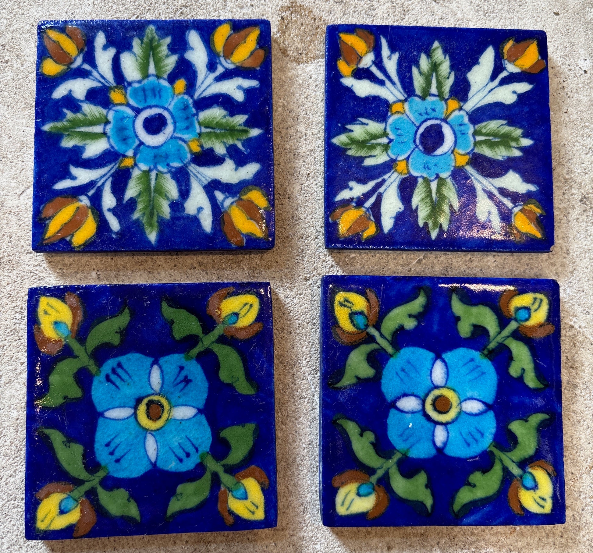 Set of 4 Hand-Painted Persian/Jaipur-Style Floral Tiles – Cobalt Ground