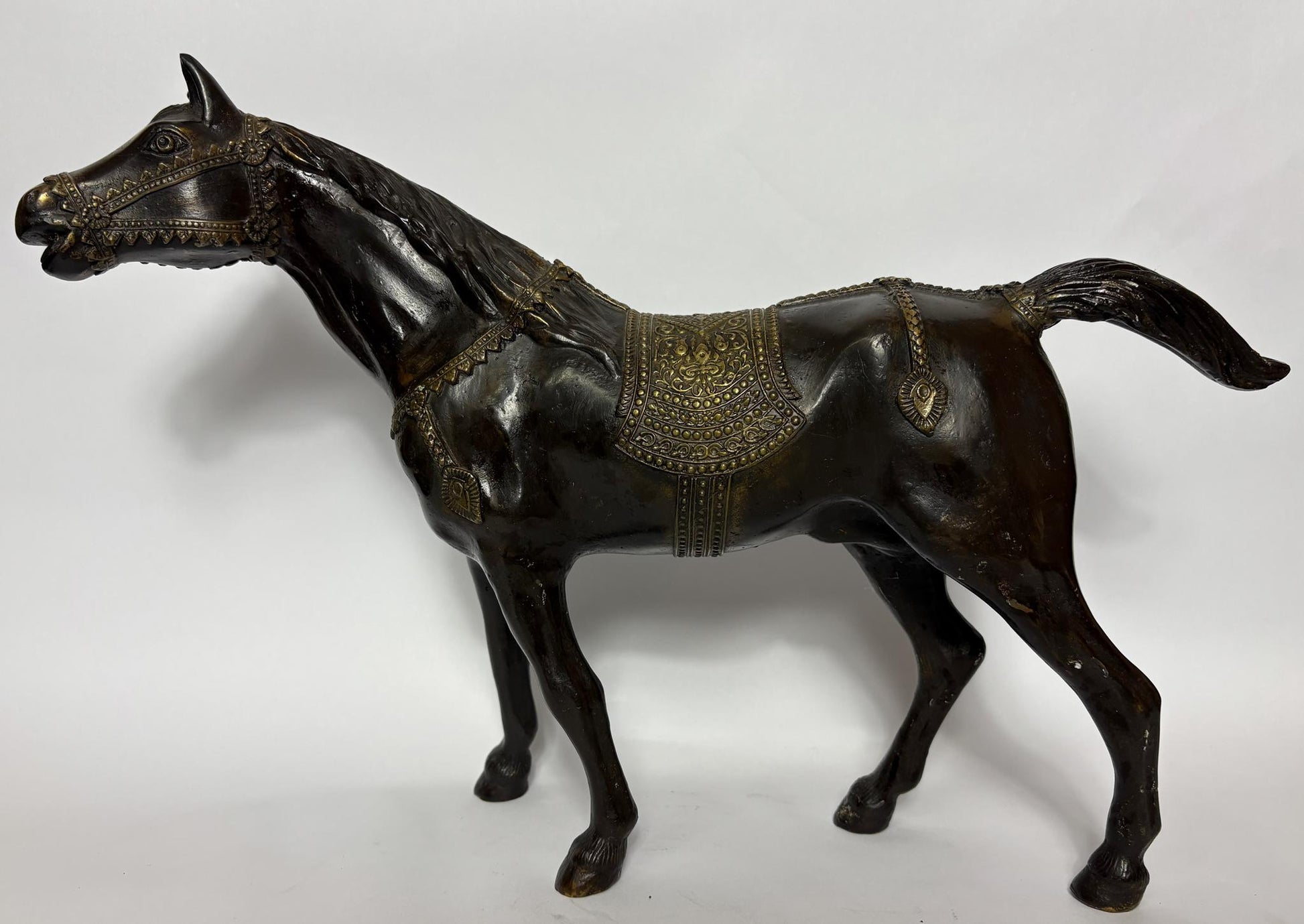 A striking vintage Indian bronze study of a richly caparisoned stallion, dating to the early–mid 20th century. Cast by the lost‑wax method in a brass/bronze alloy, the horse stands alert with finely modelled head and flowing tail, wearing an ornate saddlecloth and bridal picked out in low relief.