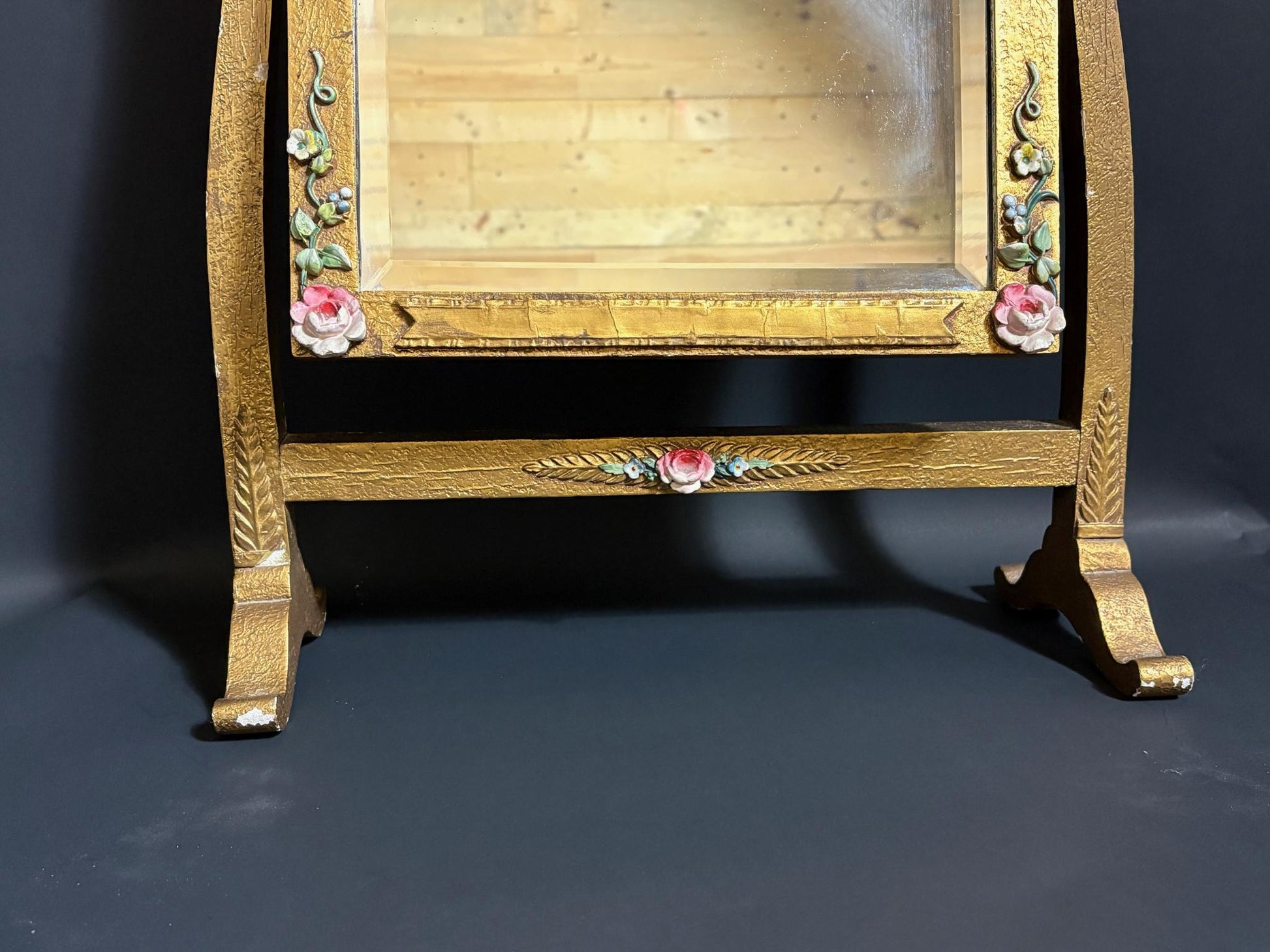 Condition: Mirror plate shows even age-spotting/foxing consistent with age. Localised losses and chips to the gesso flowers and to the gilt at the feet and edges; small abrasions to paint. Overall sound and decorative.