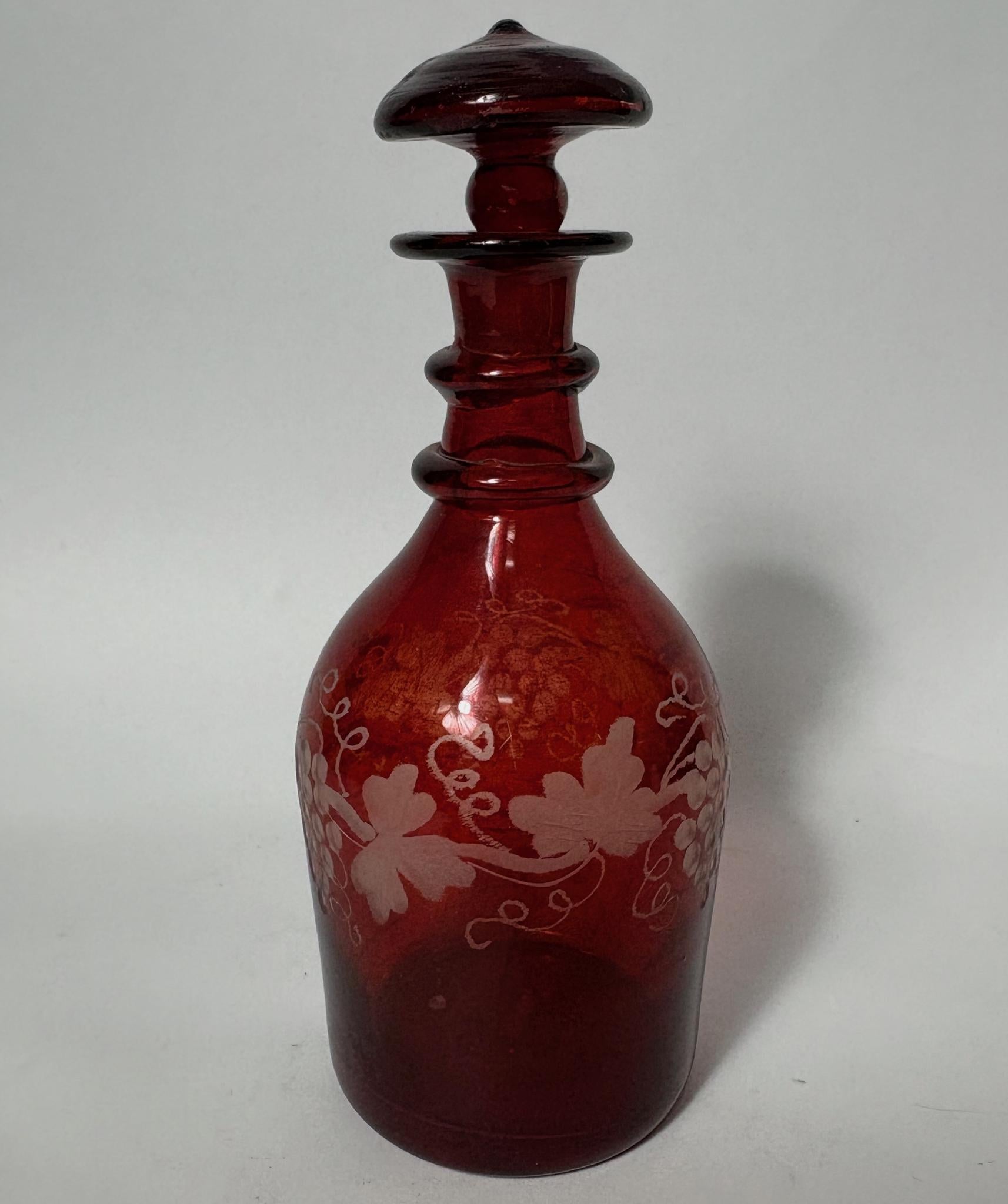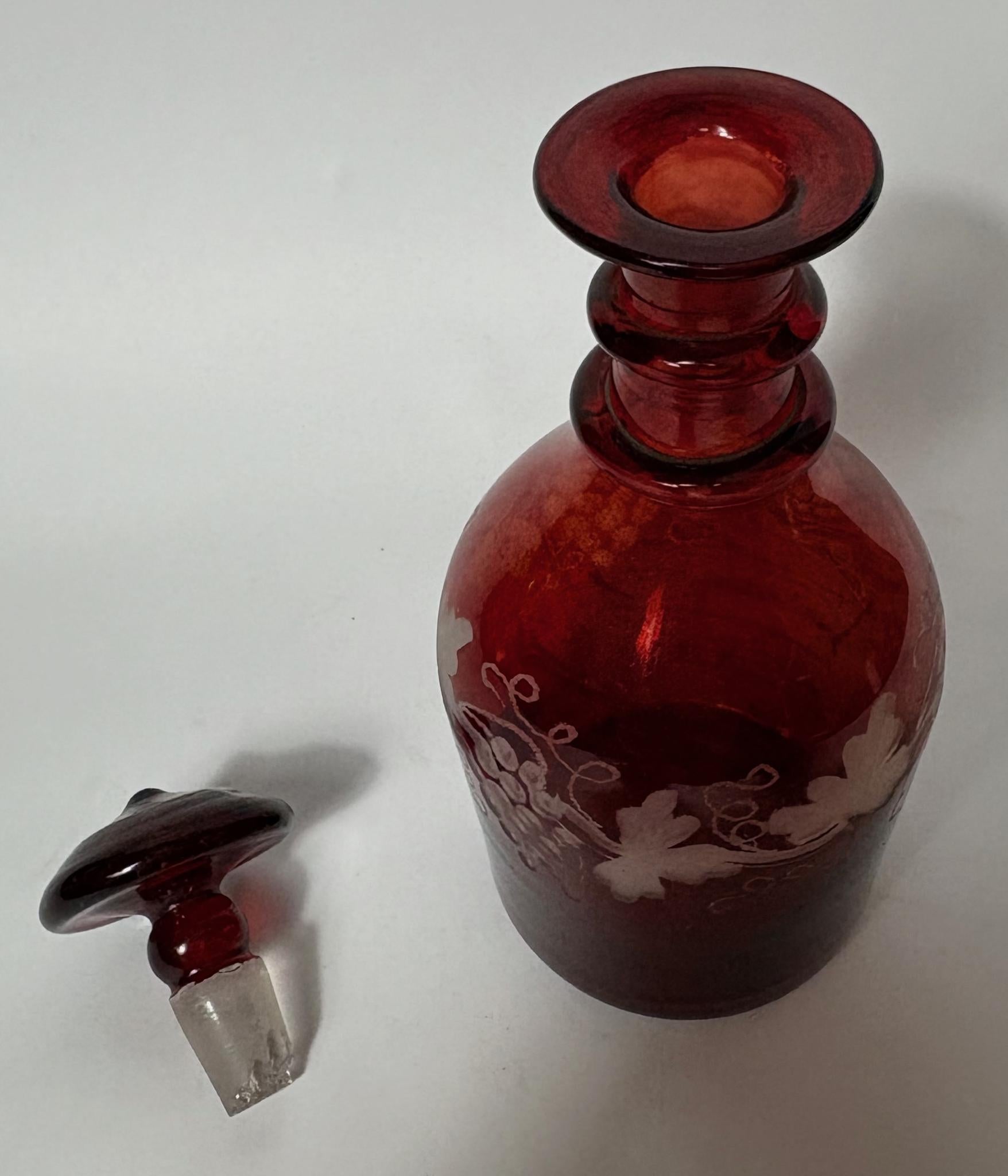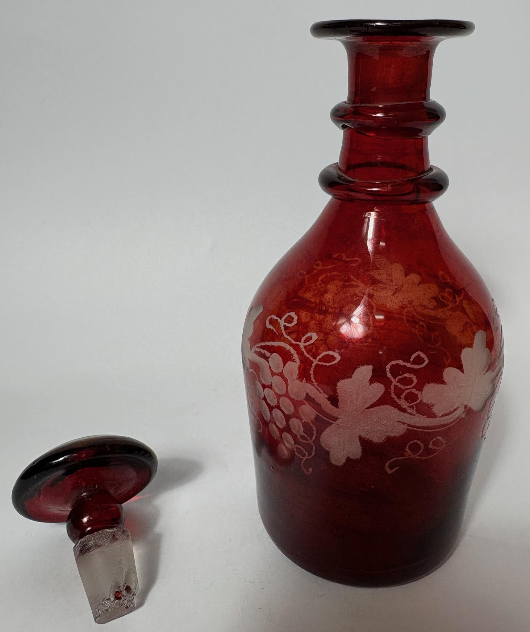 Antique Ruby Flash Glass Decanter Bottle with Stopper – Etched Vine & Grape Motif
