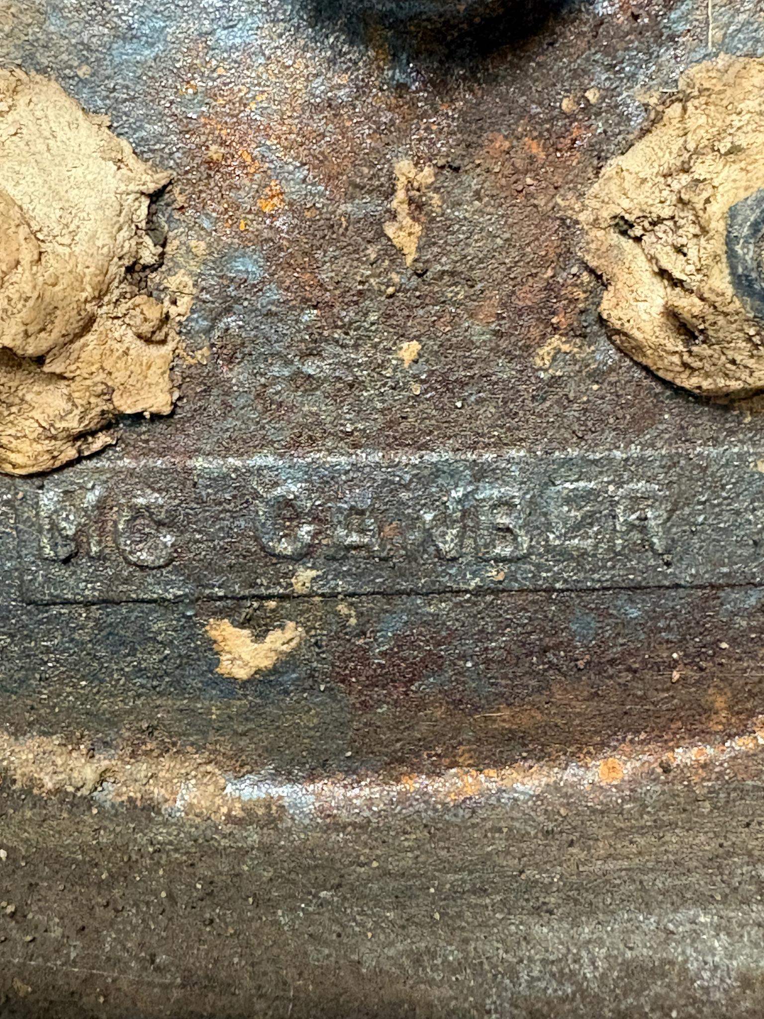 Condition: Structurally sound with honest casting wear to the reverse; light surface oxidation on the back. The front and base show a later high‑gloss repaint over earlier surfaces; scattered touch‑ups and chips to edges. Original cold paint is likely largely covered.