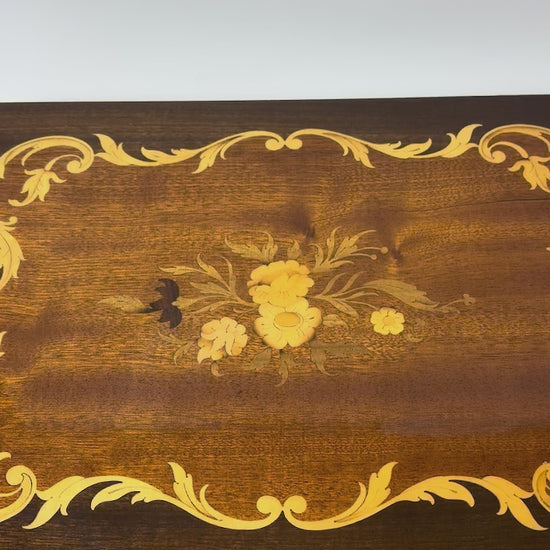 This style strongly aligns with Italian “Sorrento ware” / intarsia produced in the mid–late 20th century (c. 1950s–1970s) for the export and tourist market. Sorrento and the Naples region had a long tradition of decorative inlay from the 19th century onward; by the post‑war period, workshops produced high-quality giftware boxes, tables, humidors featuring classical scroll borders and floral bouquets, often paired with Swiss/Japanese wind‑up music movements.