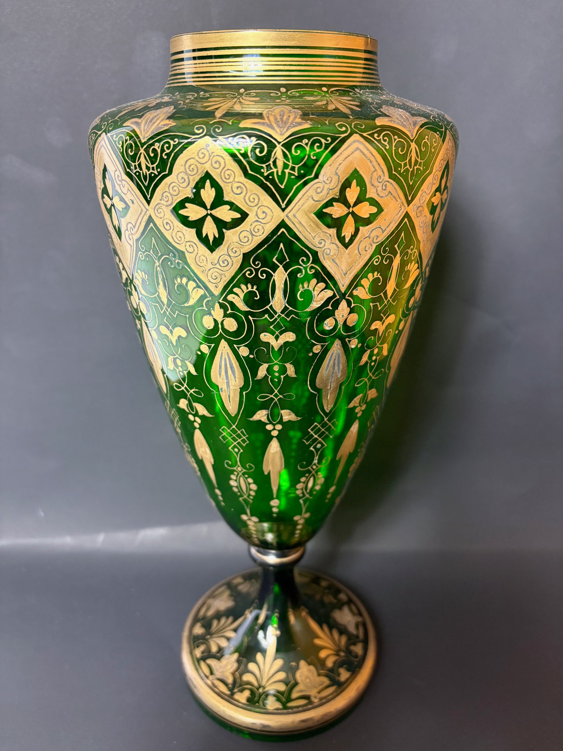 A striking emerald‑green blown glass pedestal vase, lavishly decorated in hand‑applied matt and burnished gilding with diamond cartouches and trailing foliate arabesques in the fashionable “Oriental” taste of late‑Victorian Bohemia. The form and decoration are characteristic of the luxury glass made in northern Bohemia for export in the 1880–1900 period.
