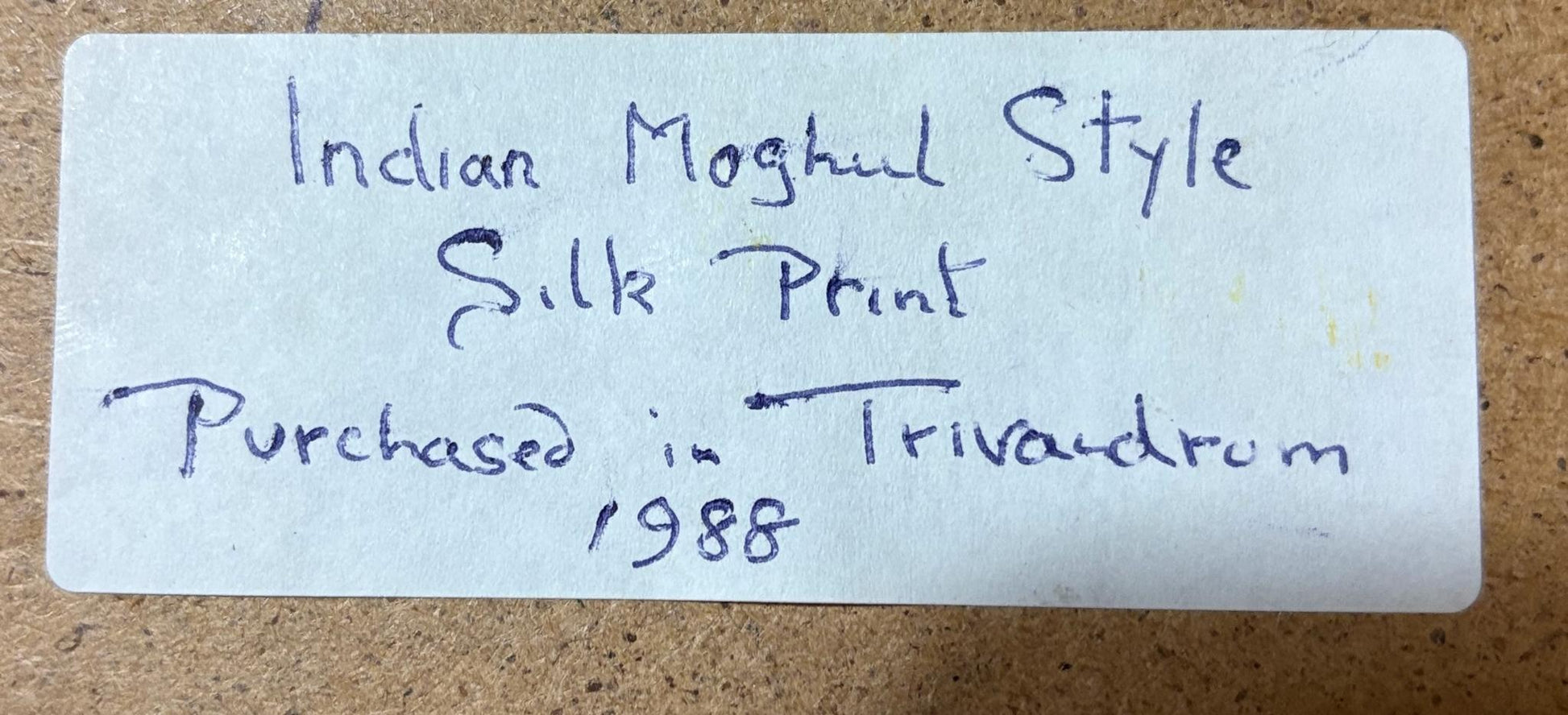 Provenance: Handwritten labels on the backs note purchase in Trivandrum (Kerala) in 1988 and in Goa in Feb. 1990 (“1 of 3”). Both areas exported Mughal‑style paintings on silk to travelers in the 1980s–90s. No workshop signature; likely Indian workshop production.