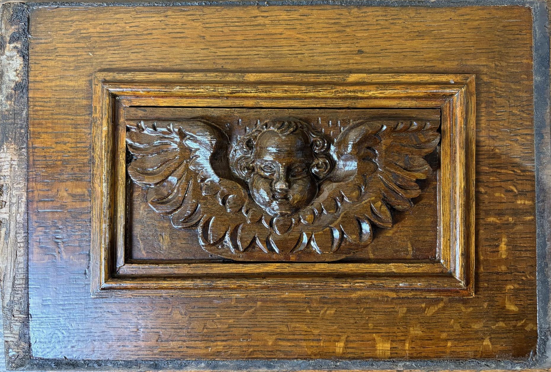In the 17th–18th century, workshops in Flanders and Northern France produced dense oak reliefs of winged cherub heads and putti for church fittings and for high-status domestic cabinetry. The acanthus cartouches and musician putti are standard Baroque iconography.