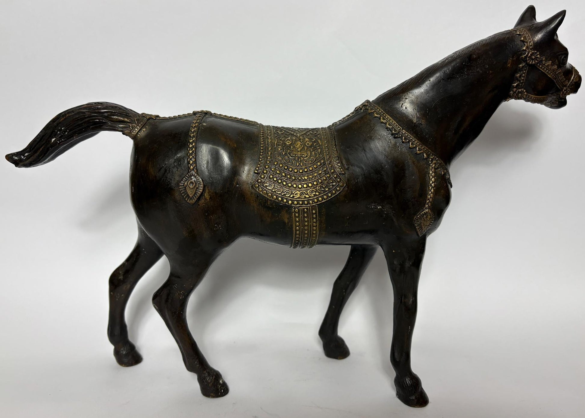A striking vintage Indian bronze study of a richly caparisoned stallion, dating to the early–mid 20th century. Cast by the lost‑wax method in a brass/bronze alloy, the horse stands alert with finely modelled head and flowing tail, wearing an ornate saddlecloth and bridal picked out in low relief.